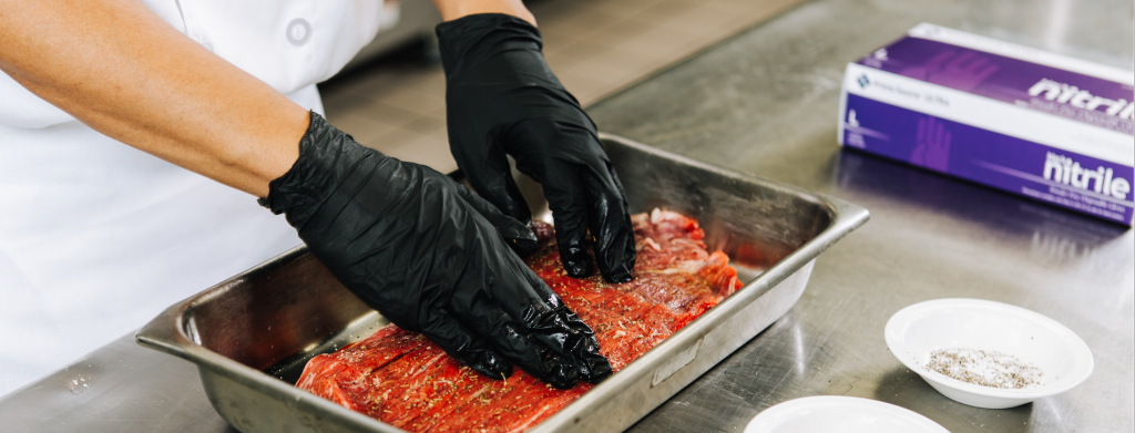Nitrile is the material of choice for a comfortable, durable, latex-free glove option. Nitrile gloves resist the breakdown caused by raw meats, oils and acidic foods. Use nitrile gloves when working with raw meats, poultry and fruit. Nitrile gloves have better chemical resistance than latex or vinyl.