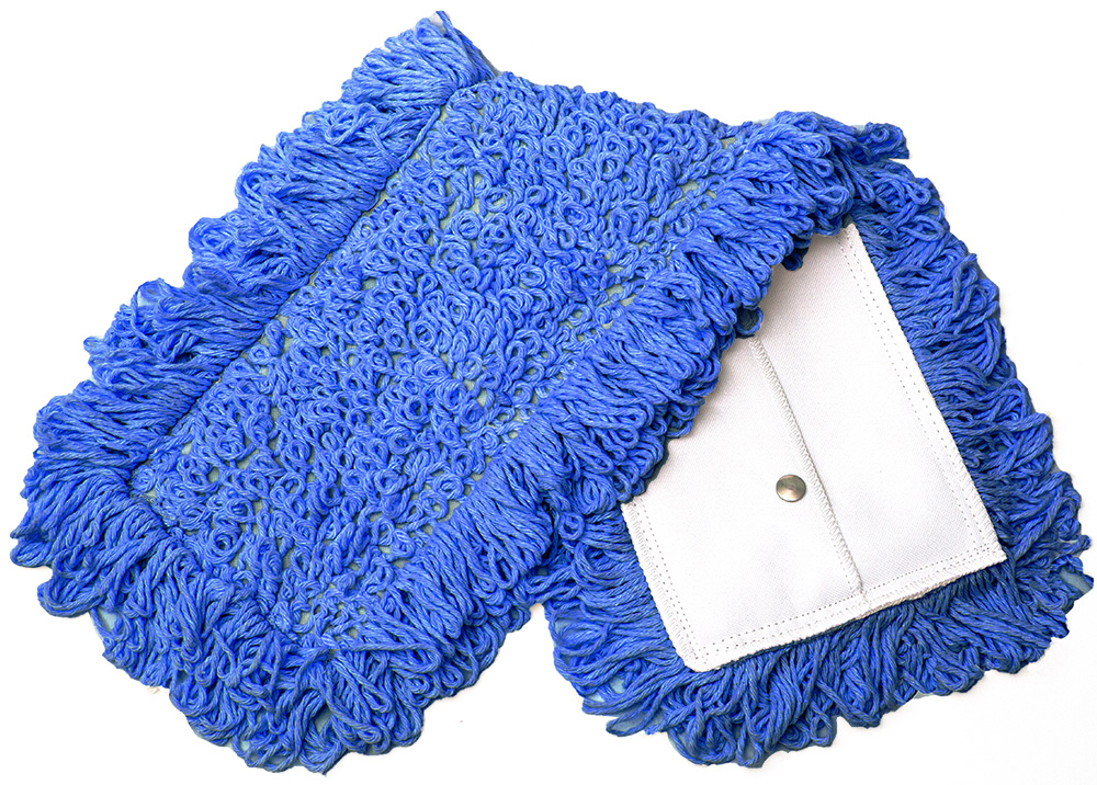 Launderable cotton/synthetic blend with polyester backing provides superior performance and durability. Yarn will not fray or unravel even with intensive laundering. Snap closures provide for long-lasting service. Each mop is individually packaged.