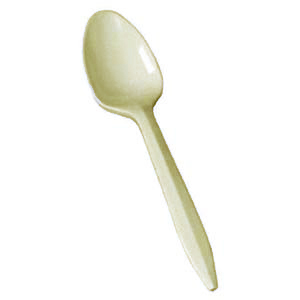 Disposable plastic teaspoon for use with many dense foods such as hard-frozen ice cream, yogurts, and desserts, and other dishes. Made of polystyrene for rigidity and durability. White plastic teaspoon coordinates with other white utensils and many tableware designs and decorations.