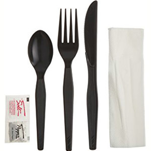 Serve any meal with this cutlery kit. Each pre-packaged wrapping contains a plastic medium weight fork, spoon and knife, as well as salt and pepper packets and a napkin.