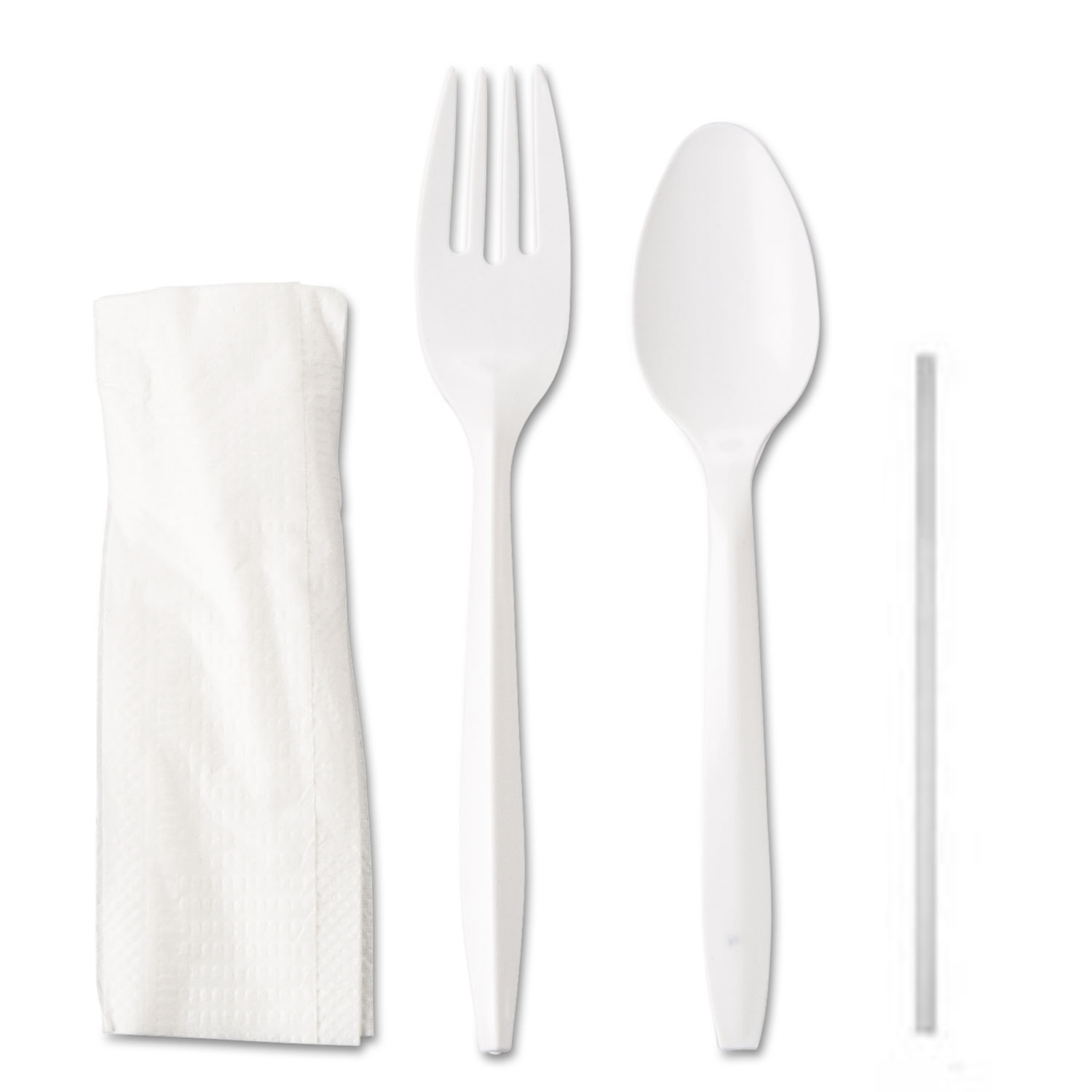 Serve any meal with this cutlery kit. Each pre-packaged wrapping contains a plastic medium weight fork and teaspoon as well as a 10″ x 10″ napkin and a 6″ straw
