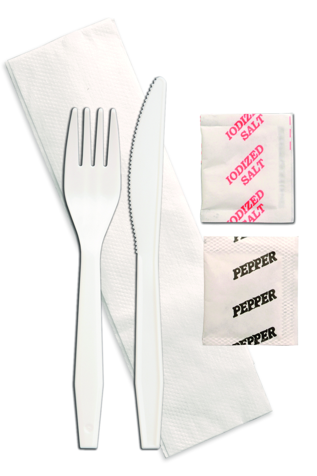Serve any meal with this cutlery kit. Each pre-packaged wrapping contains a plastic medium weight fork and knife, as well as salt and pepper packets and a napkin.