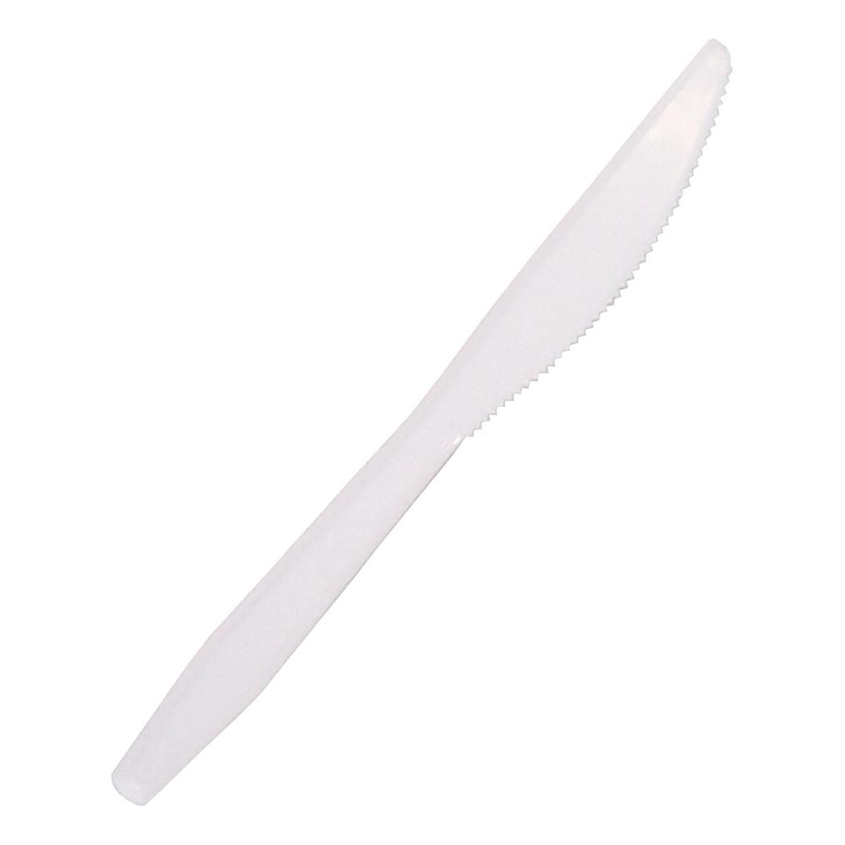 Disposable plastic knife for use with many dense foods such as hard fruits, fibrous vegetables, steak, and other dishes. Made of Polypropylene for rigidity and durability.